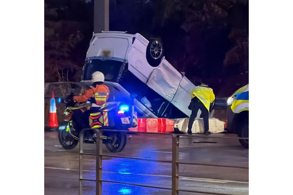 元朗的一宗發生傍晚近6時,一輛私家車沿青朗公路往元朗方向行駛,駛至近八鄉路對開時失事,撞向路邊水馬並翻轉。車上司機及乘客並無受傷,毋須送院。