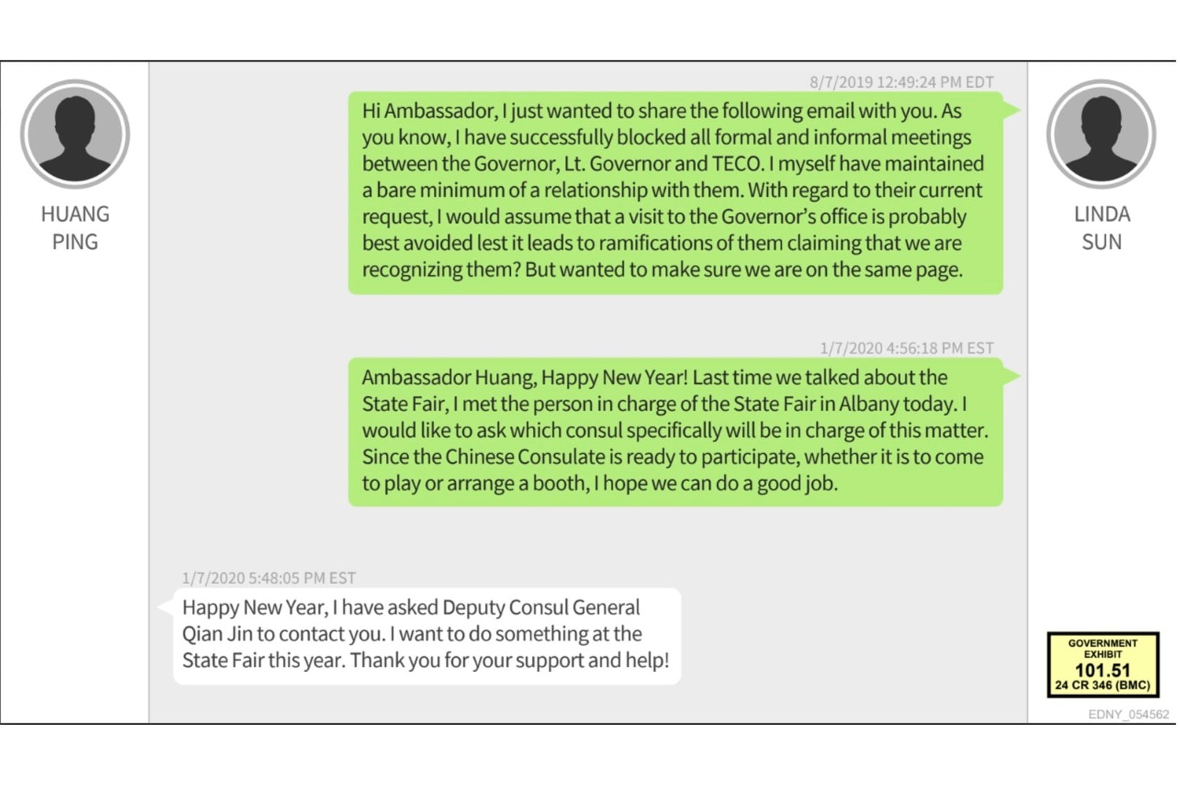 昨日(周四)庭審首先補充台灣總統蔡英文2019年訪紐約事件的細節,顯示紐約中領館總領事黃屏疑似直接指揮孫雯行事。2019年7月5日,駐紐約台北經濟文化辦事處邀請時任州長科莫及副幕僚長孫雯出席晚宴後,孫雯立即將訊息轉給中領館副領事李麗華並稱「已經攔下」,相關細節先前已披露。