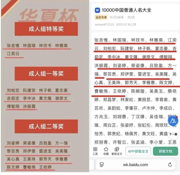 就在今年12月,這「五人組」再次轉換身份,出現在首屆華夏杯全國書法大賽獲獎名單中,獲得特等獎。且大量獲獎者姓名及排列順序,與百度文庫「10000中國普通人名大全」文檔中的內容高度重合。