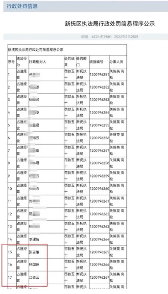 2022年5月,「張吉唯、林國瑞、江奕雲」3個名字出現在遼寧撫順市新撫區政府官網的《新撫區執法局行政處罰簡易程序公示》裏。