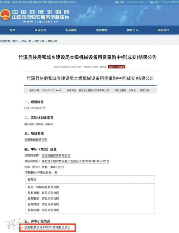 中國政府採購網3日刊登的《竹谿縣住房和城鄉建設局本級機械設備租賃採購中標(成交)結果公告》顯示,採購代理機構為湖北潤土招投標代理有限公司,供應商是竹溪創拓勞務有限公司,兩公司都是在竹谿縣經營的國企,2021年、2022年開始運作。