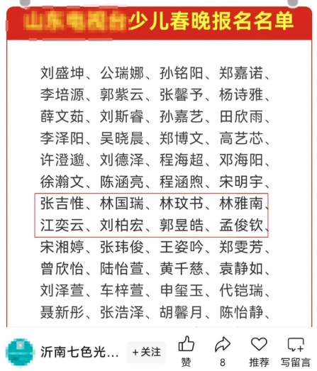比如,2023年,上述「最忙五人組」的名字出現在山東電視台少兒培訓機構公示的少兒「春晚」報名名單中。