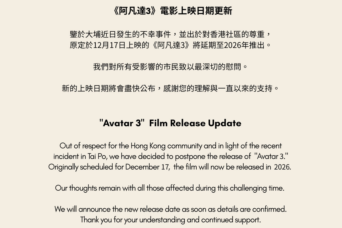 二十世紀影業今日在社交媒體發出延期公告︰「鑒於大埔近日發生的不幸事件,並出於對香港社區的尊重,原定於12月17日上映的《阿凡達3》將延期至2026年推出。我們對所有受影響的市民致以最深切的慰問。新的上映日期將會盡快公布,感謝您的理解與一直以來的支持。」
