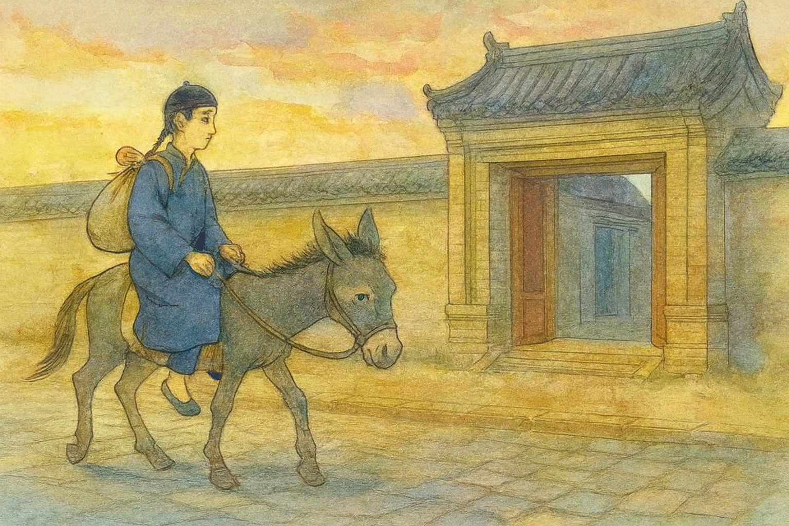 韓生慶幸能找到一戶有活口的人家,就沿著台階走了進去,大聲懇求能夠得到水來解渴、火來熱身。但沒有僕人出來應答。於是,身心疲睏的他就一邊走一邊喊:「有人嗎?」一逕走到了後院,才聽到樓上傳來一少女軟弱的應答聲。