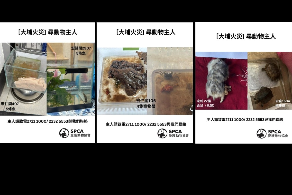 大埔宏福苑大火中,逾500動物從災場獲救,但仍然有約80隻動物下落不明。早前獲警方災難遇難者身份鑑定組(DVIU)協助搜索動物的愛護動物協會在上周六(6日)表示,DVIU的搜救動物行動結束,愛協救援隊同日亦撤離現場,並重新調配資源,支援其它有迫切需要的動物,但仍然會在接報後到災場協助。