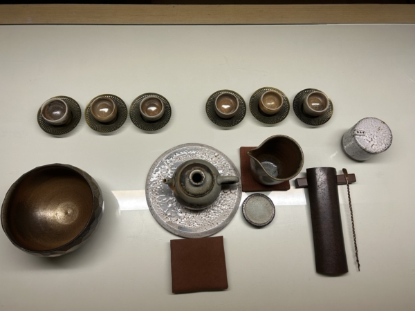 茶席有一定規範的泡茶流程,首先解說茶席茶具基本的位置安排,在桌面中心擺上壺承,上面放置茶壺,在壺承下邊放置折好的方巾,緊鄰壺承右上方放茶盅、右下方擺蓋置,再往右邊放茶則、茶針、小茶倉,壺承上邊向左、向右依序排茶杯與杯托,壺承左邊放置水方,至於電熱水壺則放在桌子下邊,靠近司茶人左邊的位置。
