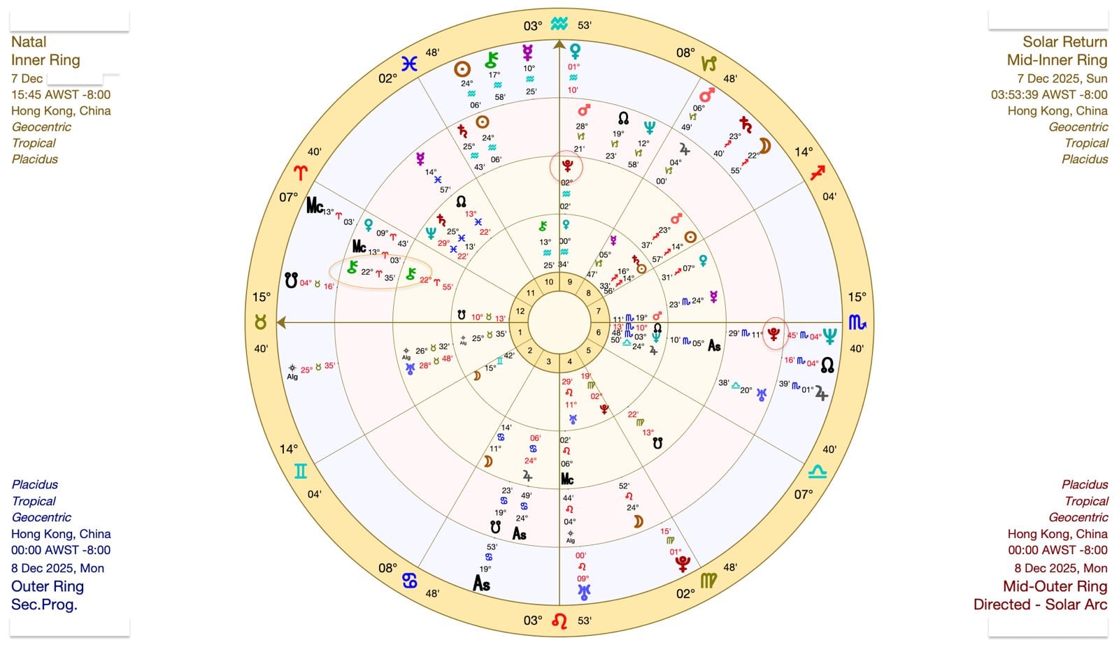 本文以一位於 12 月 7 日出生者的星盤為例,推算其來年的運勢。今次共有三種預測技巧,由內至外依次為:(甲)本命盤(Natal)、(乙)太陽回歸盤(Solar Return)、(丙)太陽弧推運盤(Solar Arc Directed)、(丁)二次推運盤(Secondary Progression)。讀者如欲了解相關技術,可參考〈名人星盤:葉劉淑儀可以連任嗎?〉三篇文章中的基礎介紹。
