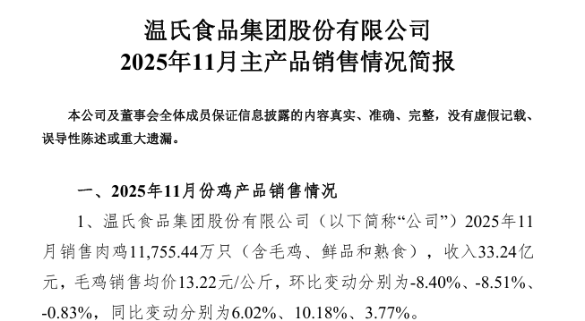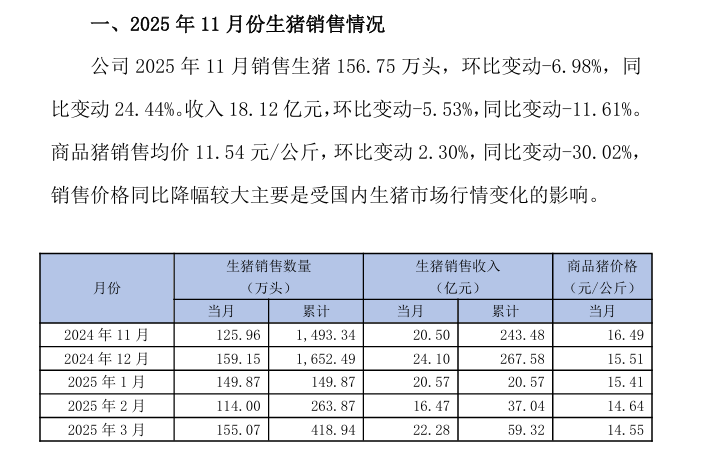 首先發布數據的是溫氏股份,其在12月5日的《2025年11月主產品銷售情況簡報》中表示,溫氏股份生豬銷售收入51.99億元(人民幣,下同),環比增長2.99%,同比下降14.19%。