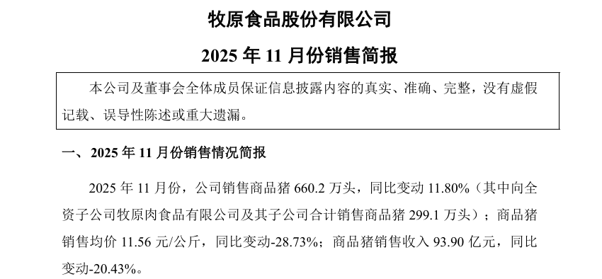 6日,牧原股份和新希望先後發布了《2025年11月份銷售簡報》和《2025年11月生豬銷售情況簡報》。牧原股份表示,商品豬銷售收入93.9億元,環比下降9.1%,同比下降20.43%。新希望生豬銷售收入18.12億元,環比下降5.53%,同比下降11.61%。
