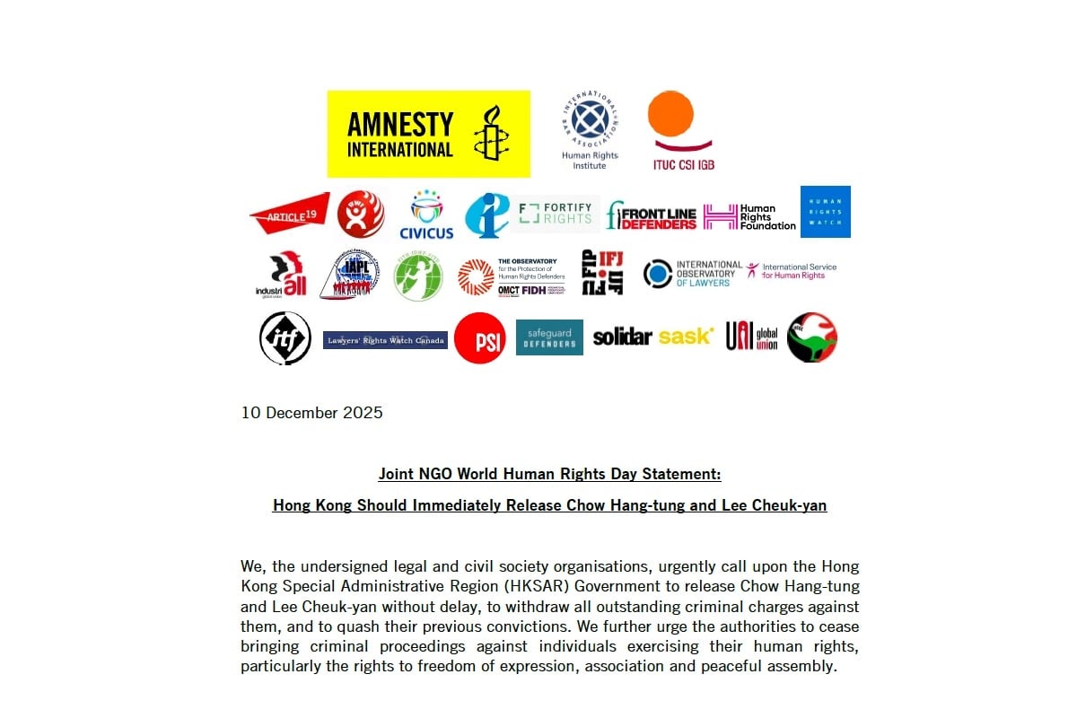 27個國際人權組織、工會和法律界專業團體,在周三(10日)國際人權日發出聯合聲明,呼籲港府釋放已解散的支聯會前正副主席李卓人、鄒幸彤,並容許和平紀念「六四」,與立即廢除所有侵犯人權的法律等。