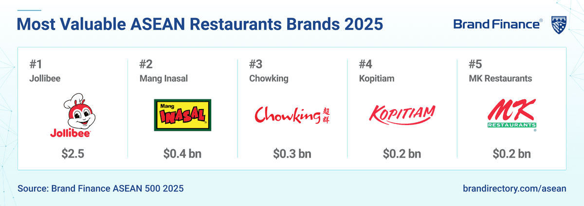 Jollibee集團的國際擴張步伐持續加速,旗下三大旗艦品牌,Jollibee、Mang Inasal與Chowking再度於 Brand Finance《ASEAN 500 2025》排行榜中包辦東盟區餐飲品牌價值前三名,穩居該區最具價值的餐飲品牌之列。