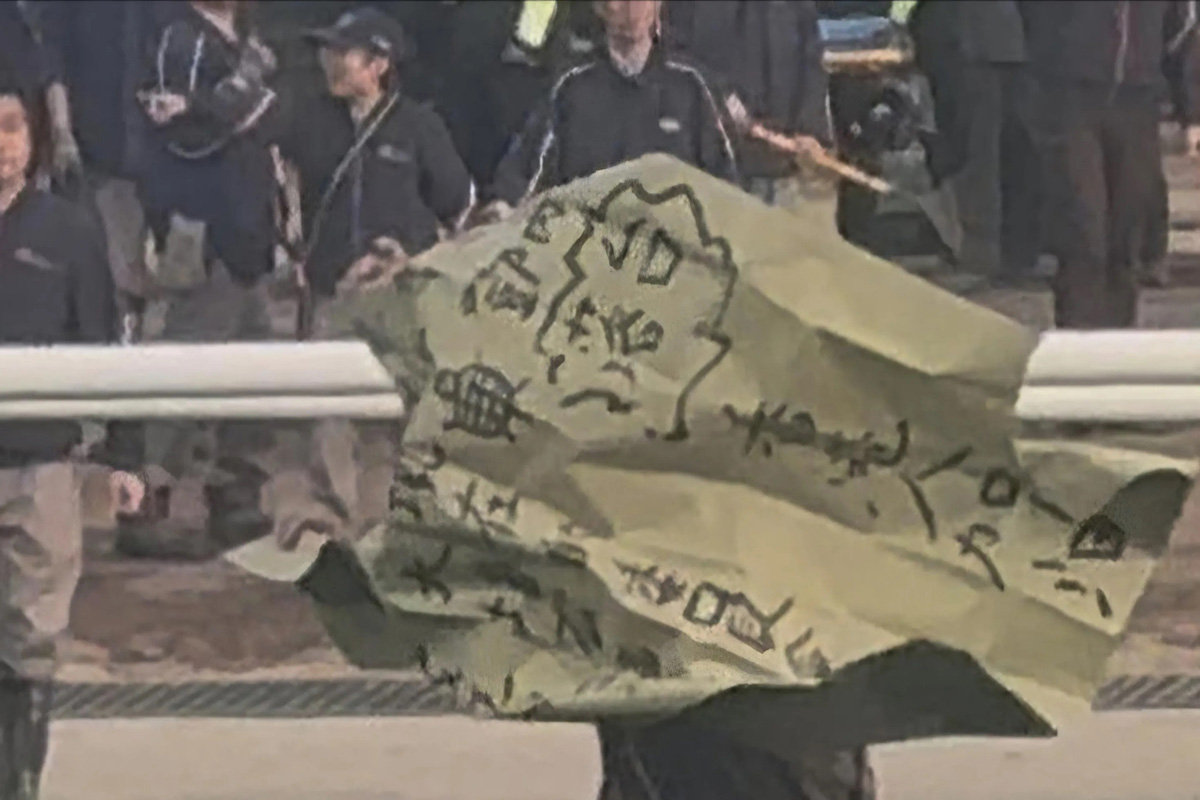 沙田馬場今日(14日)舉行「浪琴香港國際賽事」,在下午近5時第8場賽事中途,一名男子突然手持一張寫有「宏福苑」、「委員會」及「落台」等字句的橫額,在近終點處衝入草地賽道。