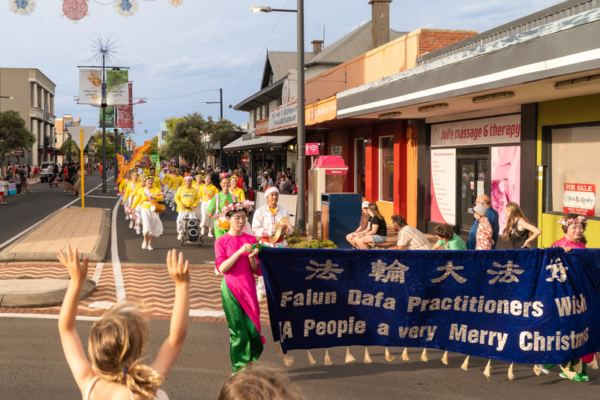 2025年12月14日,澳洲西澳州珀斯市部份法輪功學員參加了西澳南部城市班伯里(Bunbury)市的聖誕遊行。圖為法輪功團體的遊行隊伍。(周鑫/大紀元)