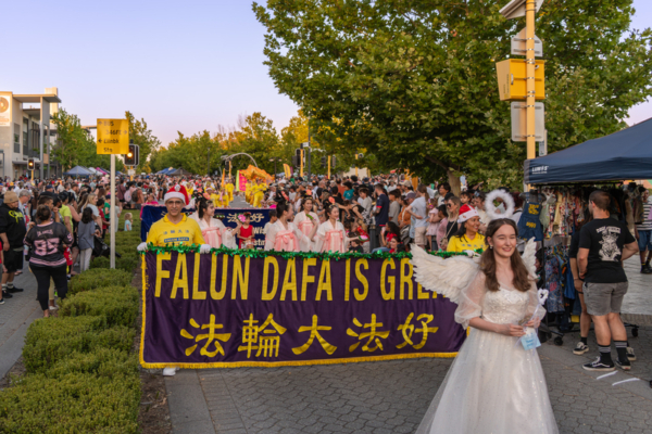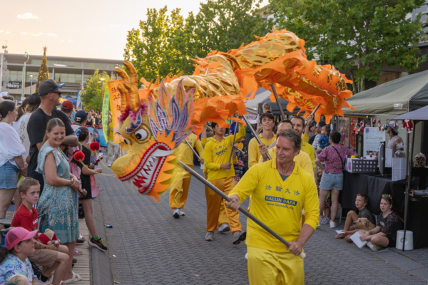 2025年12月13日,澳洲西澳州珀斯市部份法輪功學員參加了珀斯東北部的艾倫布魯克(Ellenbrook)區的聖誕節慶活動,圖為法輪功團體的遊行隊伍。(周鑫/大紀元)