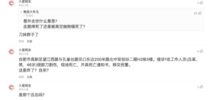 一位疑似醫護人員爆料稱,「合肥市高新區望江西路與孔雀台路交口東邊200米路北中安創谷二期H2棟5樓。接診1名工作人員(呂某,男,46歲)頸部刀割傷,現場死亡,開具死亡通知書,移交警察」。