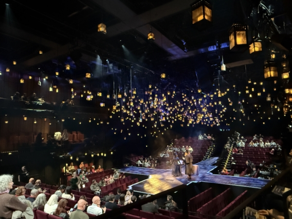另一邊廂,《聖誕頌歌》的舞台劇再次綻放新的光彩。在柏爾曼表演藝術中心(Perelman Performing Arts Center,PAC)的演出中,數百盞懸掛於空中的燈籠,像星河般照亮劇院;演員們手鈴與合唱交織出的聖誕樂聲,在空氣中蕩漾。演員走入觀眾席,送上薑餅與柑橘;聖誕大餐從天而降、穿越觀眾頭頂滑向舞台。這是一場結合沉浸式劇場、互動體驗與奇幻視效的作品,與商人之家那種極簡的古典語彙截然不同,卻同樣令人心動。