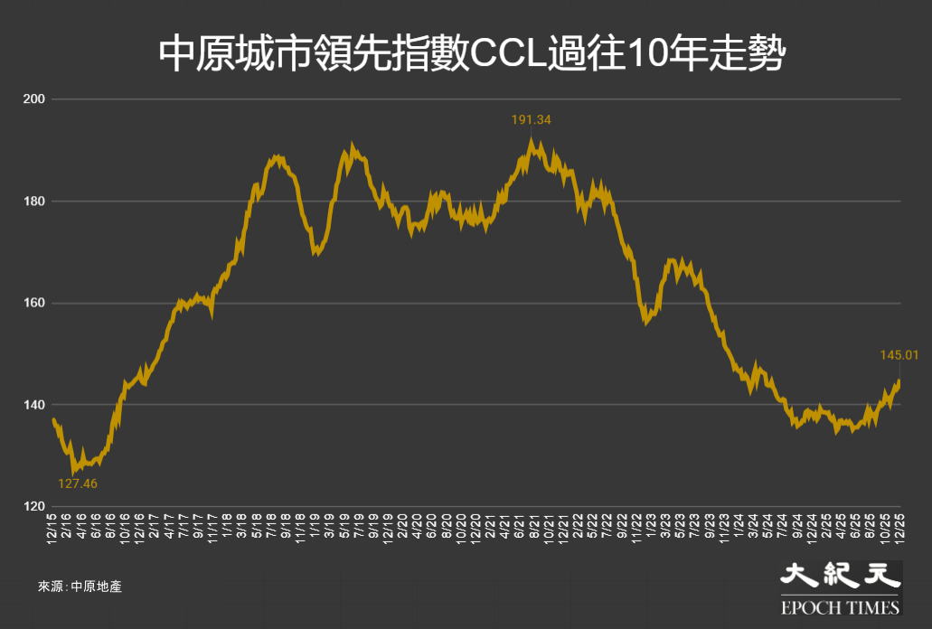 中原地產研究部高級聯席董事楊明儀指出,兩次減息後,樓價升幅加快;加上憧憬12月減息,買家積極入市,二手交投增加,刺激CCL連升2周共1.38%,並帶動八大樓價指數齊升,是2025年10月中後9周以來再現。不過,火災發生後,市場情緒受影響,發展商暫停推盤;加上業主反價,令二手買賣放緩,惟樓價升勢未變,預期年底前CCL在144至145點水平徘徊。CCL只要再升1.99點,便會到達明年首季目標147點,即2024年撤辣後的高位。今年樓價暫時累升5.35%。