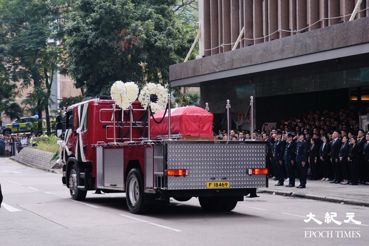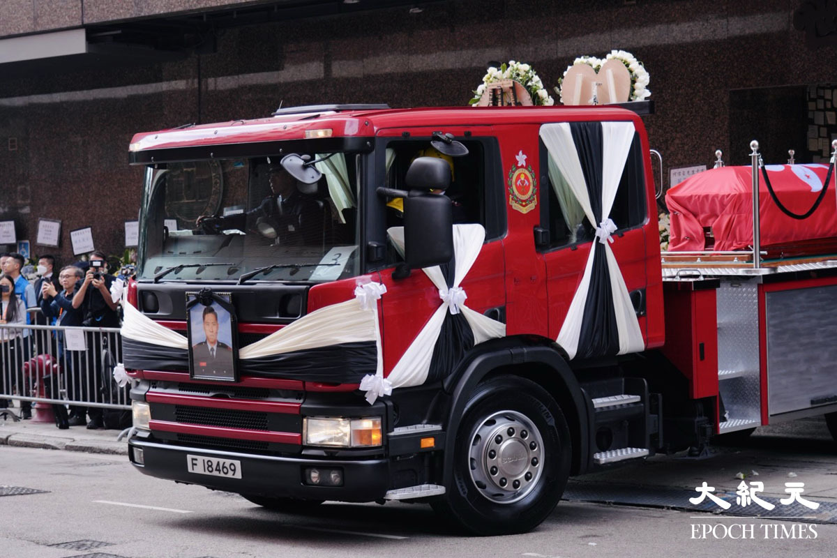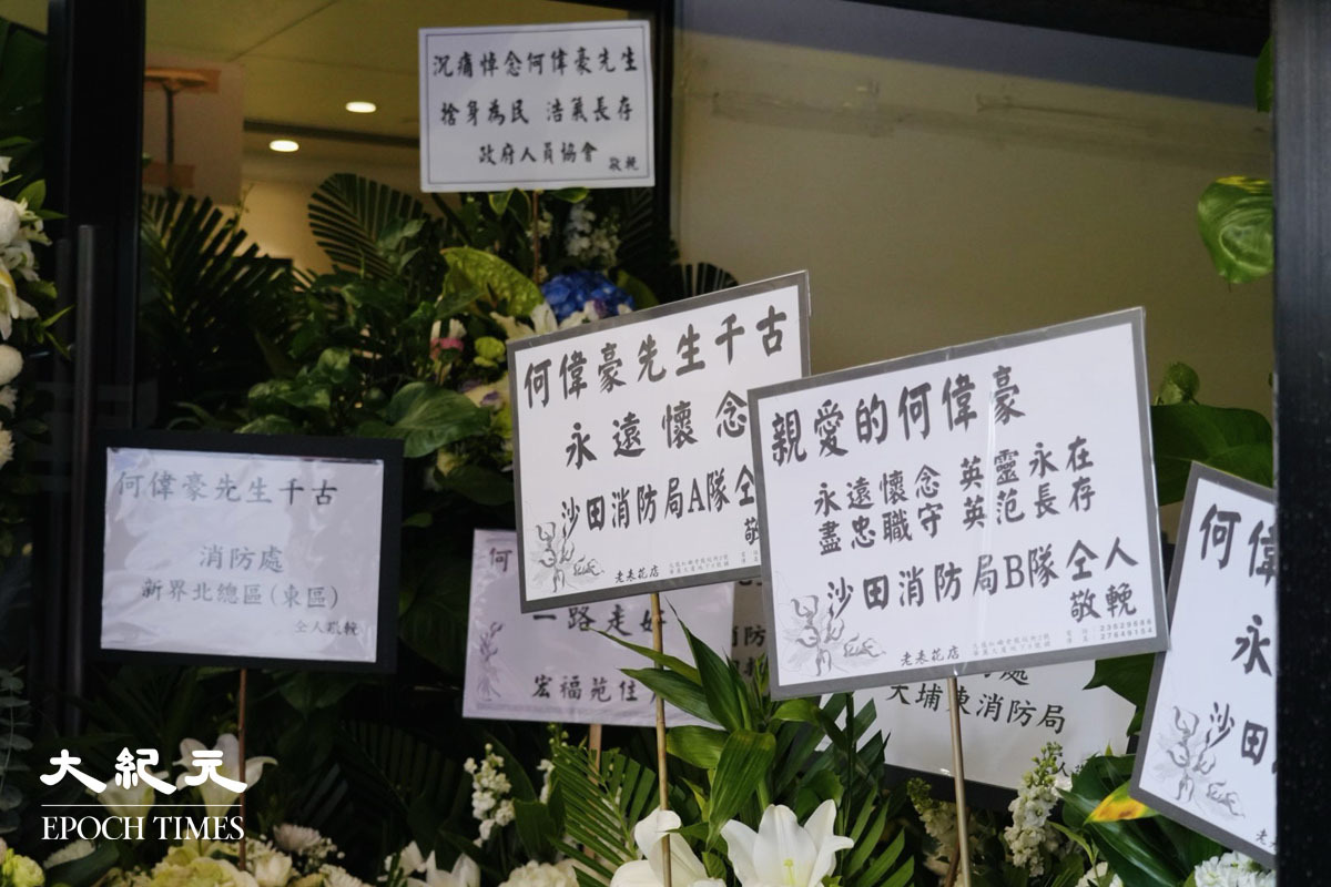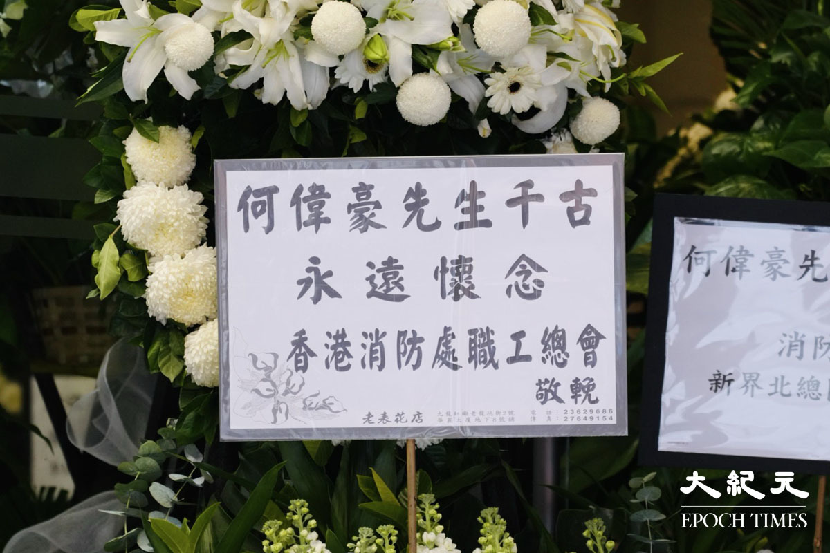 在大埔宏福苑火災中殉職的消防員何偉豪,消防處今日在九龍紅磡世界殯儀館為他舉行最高榮譽喪禮。