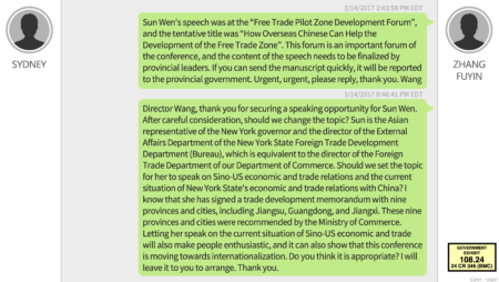 李熙慶和張富印一方面在美國政界活動,另一方面向中共官方報告孫雯的角色,協助安排發言、審稿、行程與接見。2017年3月14日,張富印在與李的微信討論中,轉貼他與中共「王主任」的對話。內容顯示孫雯將在「河南自貿試驗區發展論壇」發言,題目為「海外華人如何協助自貿區發展」,並需河南省領導審定稿件。王主任催促儘快提交。張回覆建議調整主題,讓孫雯以紐約州長亞洲代表及州對外貿易發展局外事處處長身份,談中美經貿與紐約州對華合作。