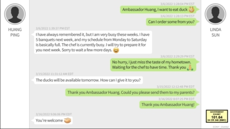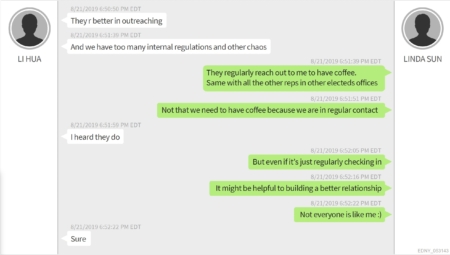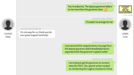 孫雯也不忘向總領事黃屏表功:「如你所知,我已成功阻止州長和副州長與經文處之間的所有正式和非正式會議。我自己與他們的關係保持在最低限度。」在另一段簡訊中,中領館領事沈希直言:「你是連接我們與庫默州長團隊最重要的樞紐。」