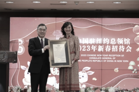 直到調查人員出示一張照片:2023年1月,紐約中領館新春招待會上,孫雯手持一份裝裱好的州長新年褒揚令,與總領事黃屏並肩合照。