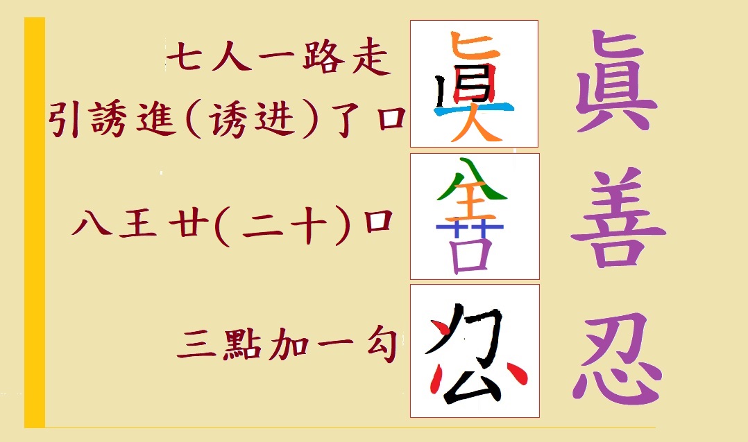 「八王廿口」,為「善」。上面是個倒寫的「八」,下面是「王」,再下面是中文數字「廿」(二十),最下面是個「口」,組成「善」字。連起來也就是法輪大法提倡的「真善忍」修煉原則。怎麼樣,神不神奇?