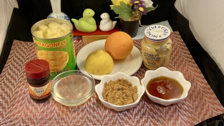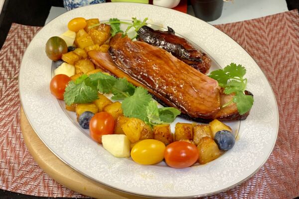 把火腿片切出放碟上,旁邊放菠蘿粒、車厘子蕃茄、酸瓜,淋上汁液。