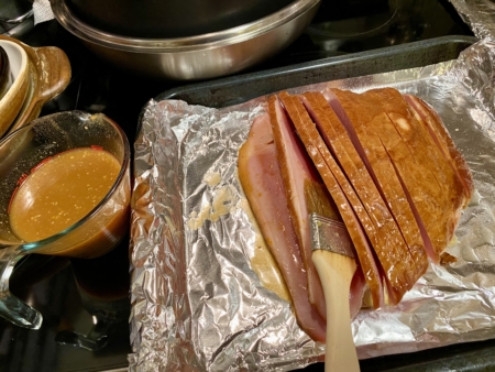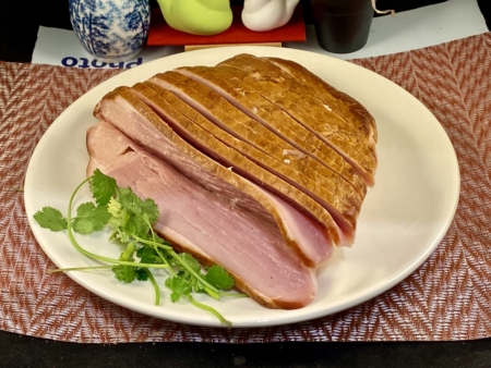 烤熟火腿1個(約3磅,用刀切成兩厘米片狀,但不要切斷底部)
