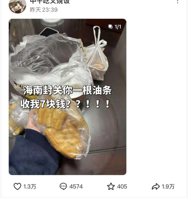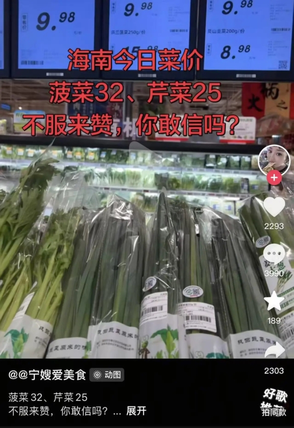 有網民晒出了海南封關後的菜價。菠菜要32元(人民幣,下同)/斤,芹菜要25元/斤。還有網民表示他出門去買了一根油條,結果被收了7塊錢。