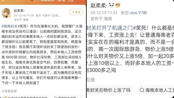 12月18日,歌手趙柔柔在微博帖稱,海南封關政策對本地居民沒有實惠,物價尤其是蔬菜、肉類、餐飲和外賣大幅上漲,而本地人工資仍僅1800–3000元,生活壓力大。該帖隨後被刪除。12月19日,她再次發帖呼籲降物價、漲工資,讓普通海南居民真正受益,並批評政策反覆、宣傳與實際效果不符。這則帖子也被刪除。