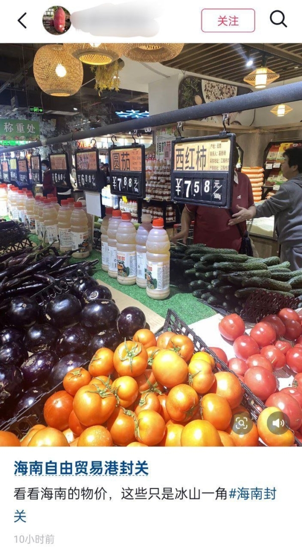 12月18日,海南自貿港正式啟動全島封關,官方大肆宣傳。不過當地民眾說封關後物價變貴,特別菜價離譜。但網上的質疑聲音遭封殺。