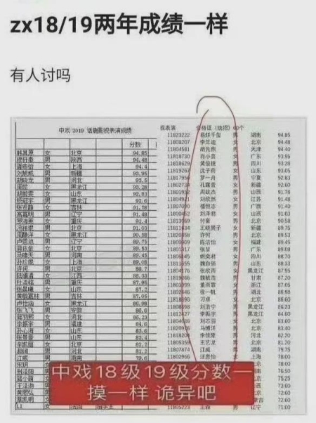 近日網傳的一份藝考成績單顯示,2018年,中戲明星藝考生扎堆,有易烊千璽、李蘭迪、胡先煦、羅一舟等,藝考成績排名順序也順著各自的知名度;2019年,明星藝考生也不少。仔細看兩年的分數表,發現整個成績單的分數都一樣,連小數點都一致,看起來像是只改了姓名、籍貫和性別,分數就像是複製黏貼。