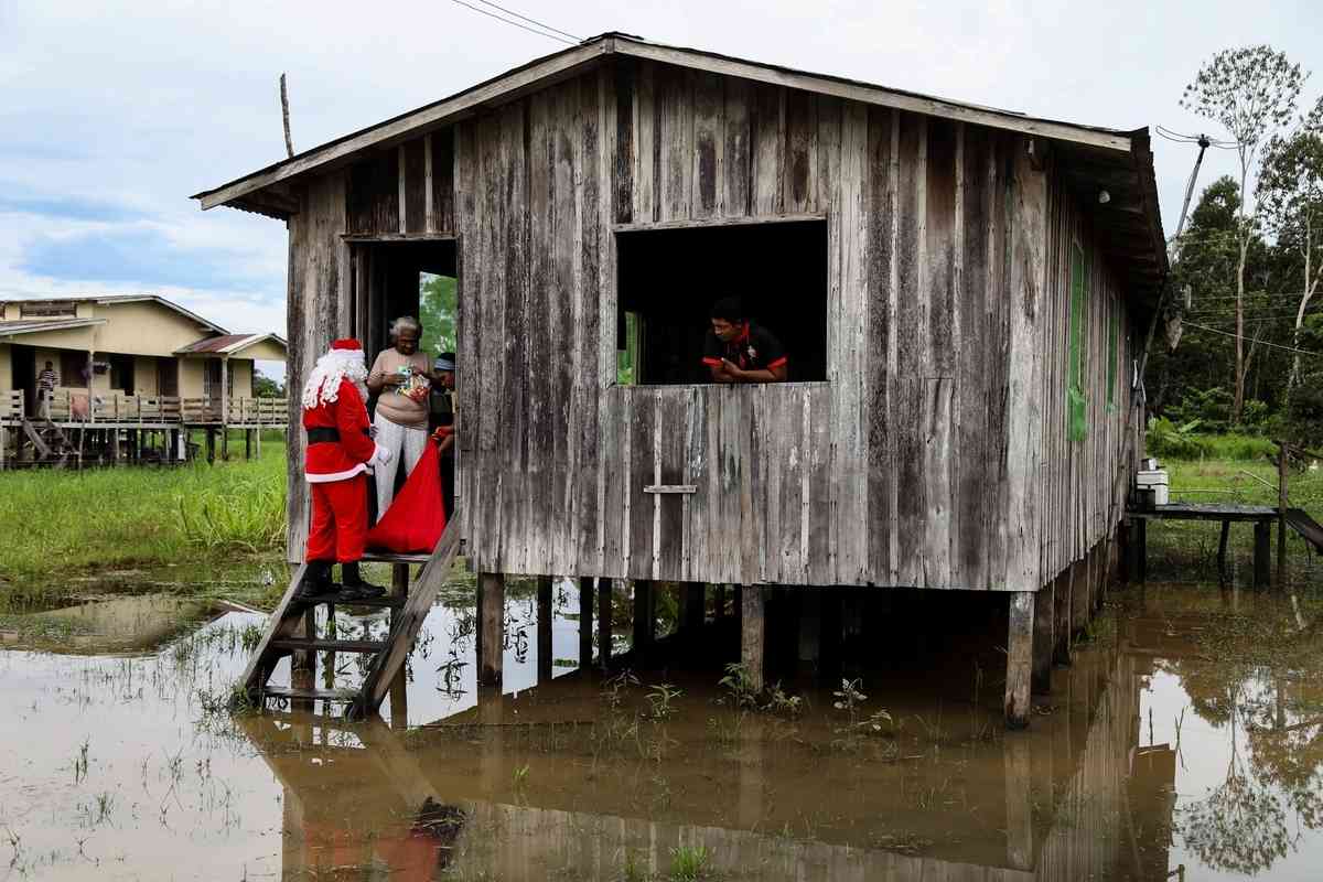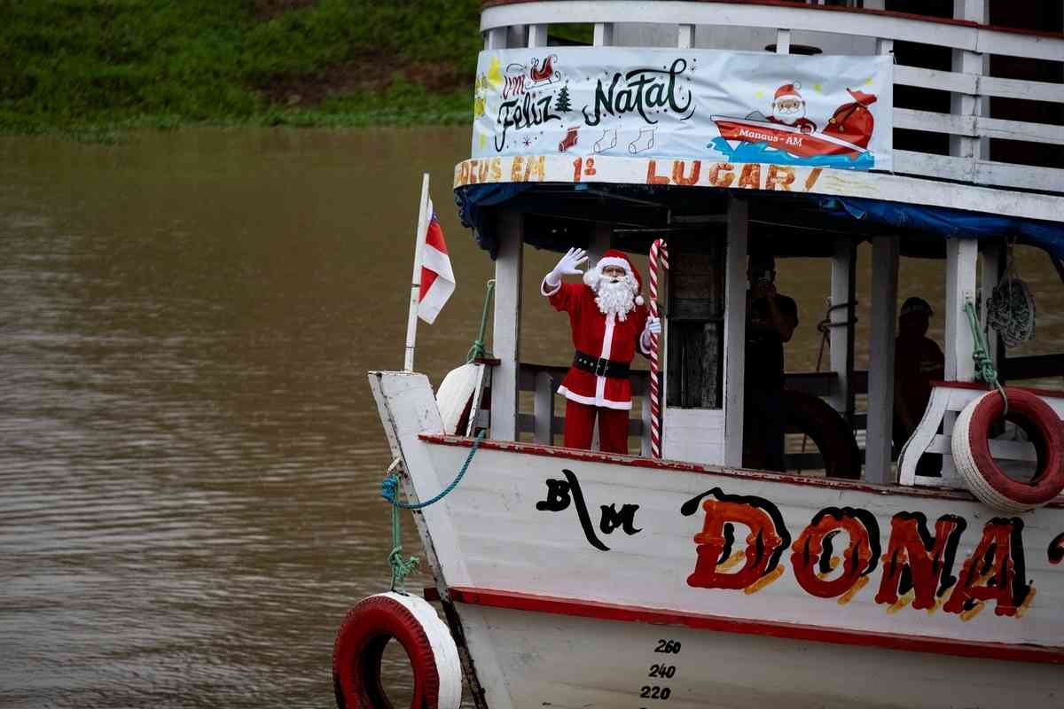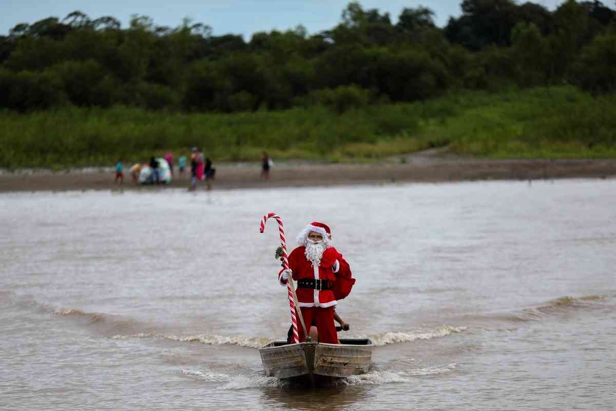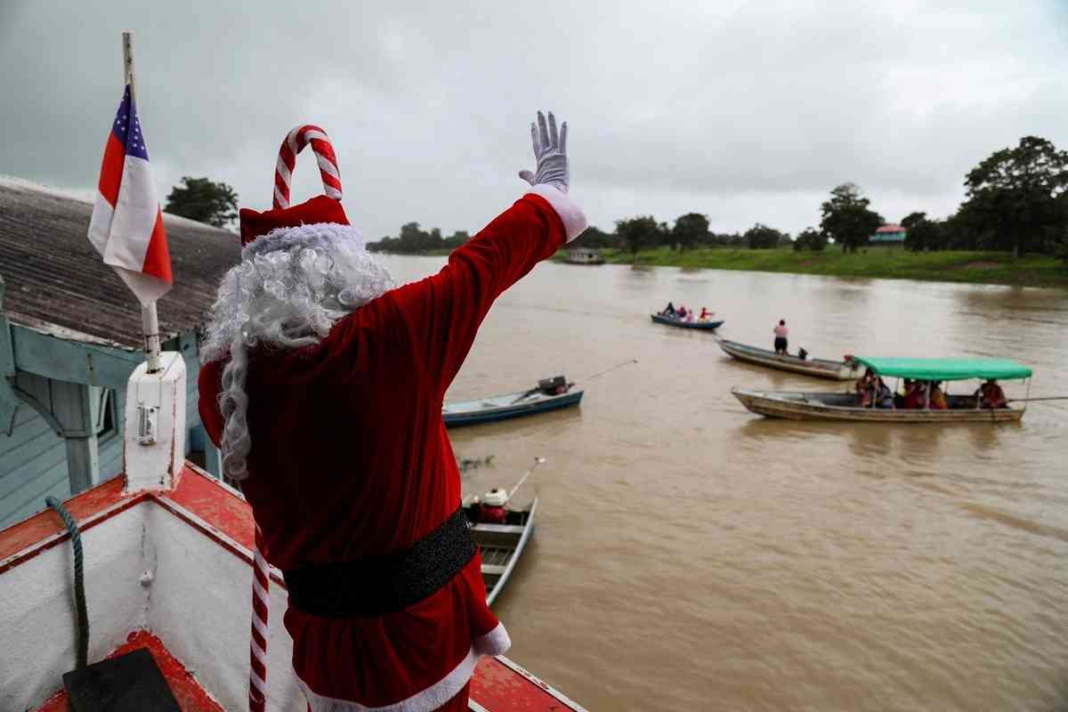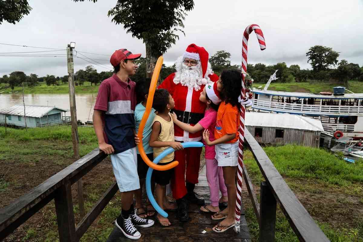 上周六(12月20日),在巴西亞馬遜州的一個偏遠河流社區,聖誕老人不是駕駛馴鹿雪橇,而是乘船沿著亞馬遜支流內格羅河緩緩進入當地,給那裏的兒童送上禮物和節日祝福。