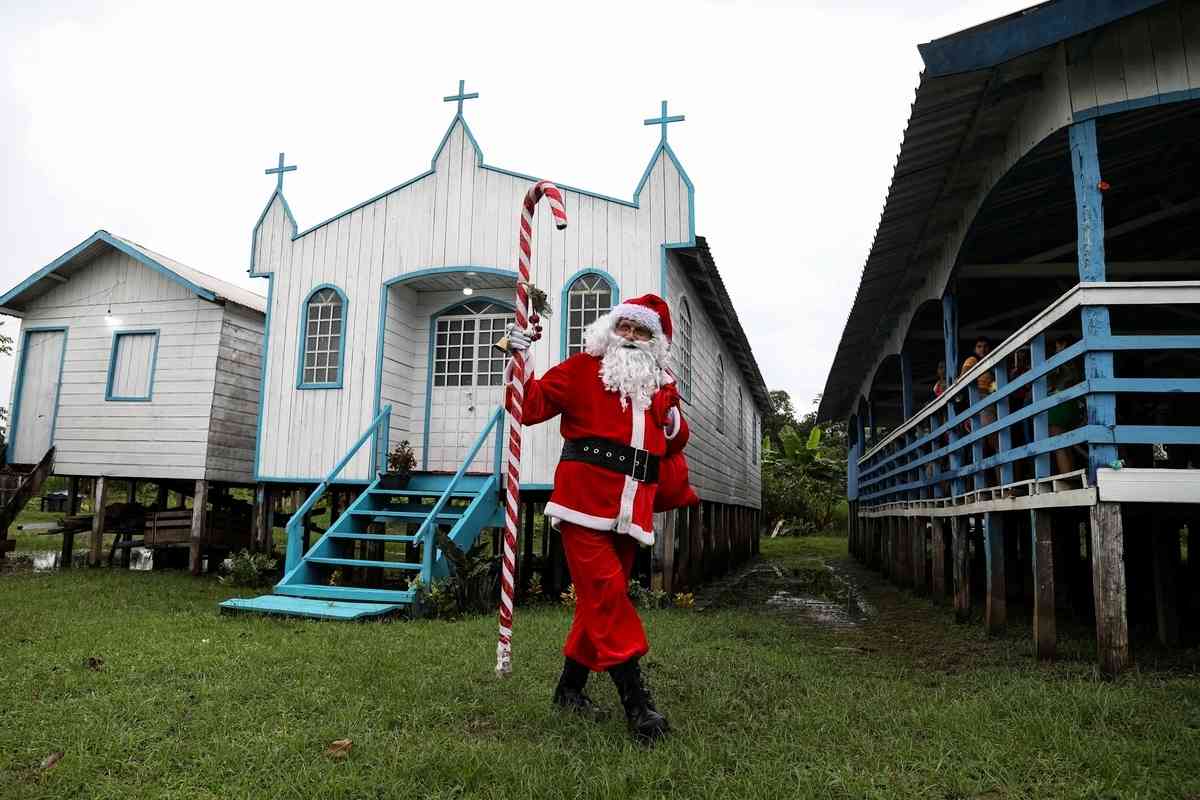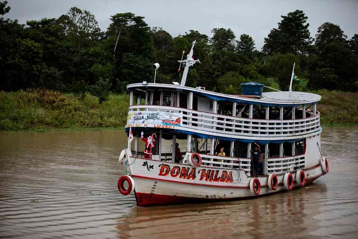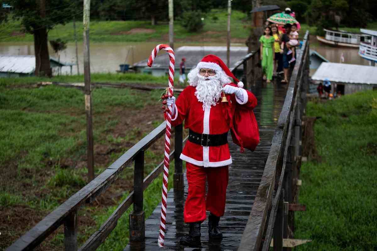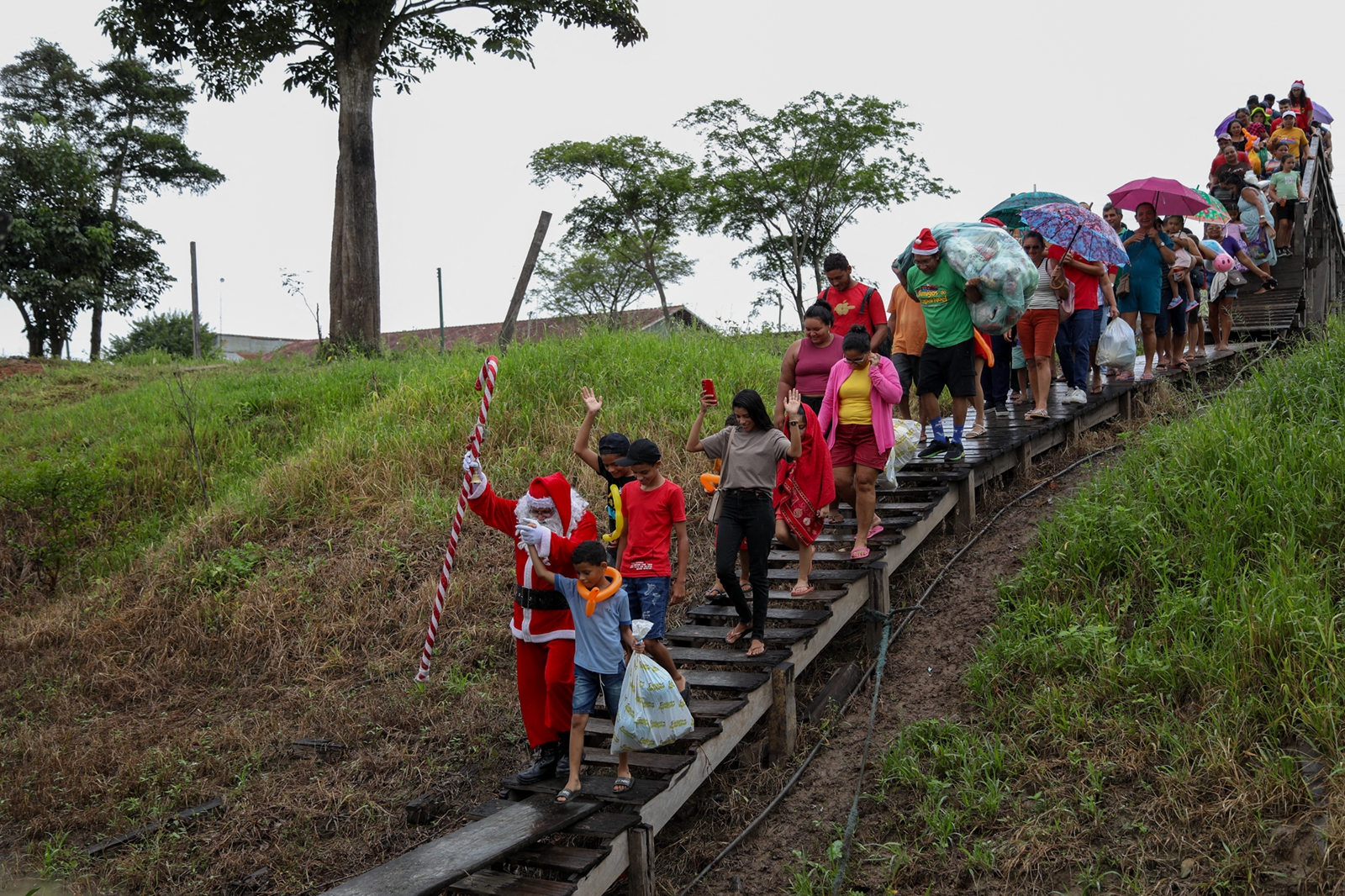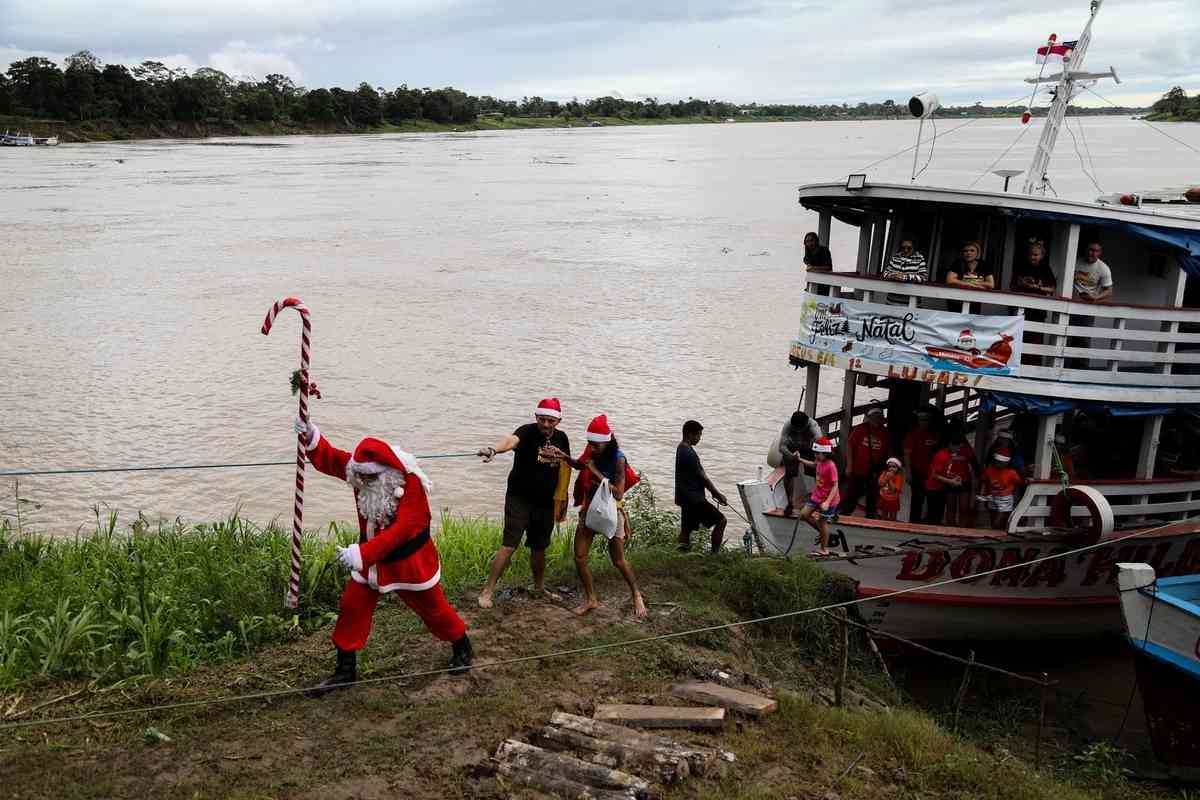 上周六(12月20日),在巴西亞馬遜州的一個偏遠河流社區,聖誕老人不是駕駛馴鹿雪橇,而是乘船沿著亞馬遜支流內格羅河緩緩進入當地,給那裏的兒童送上禮物和節日祝福。