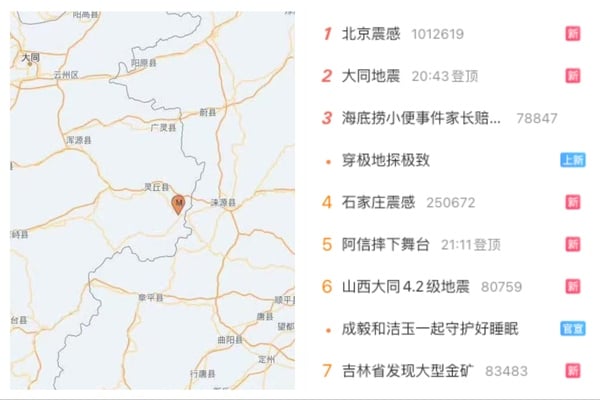 標籤為「北京震感」「大同地震」「山西大同4.2級地震」「石家莊震感」的話題均衝入微博熱搜前十。