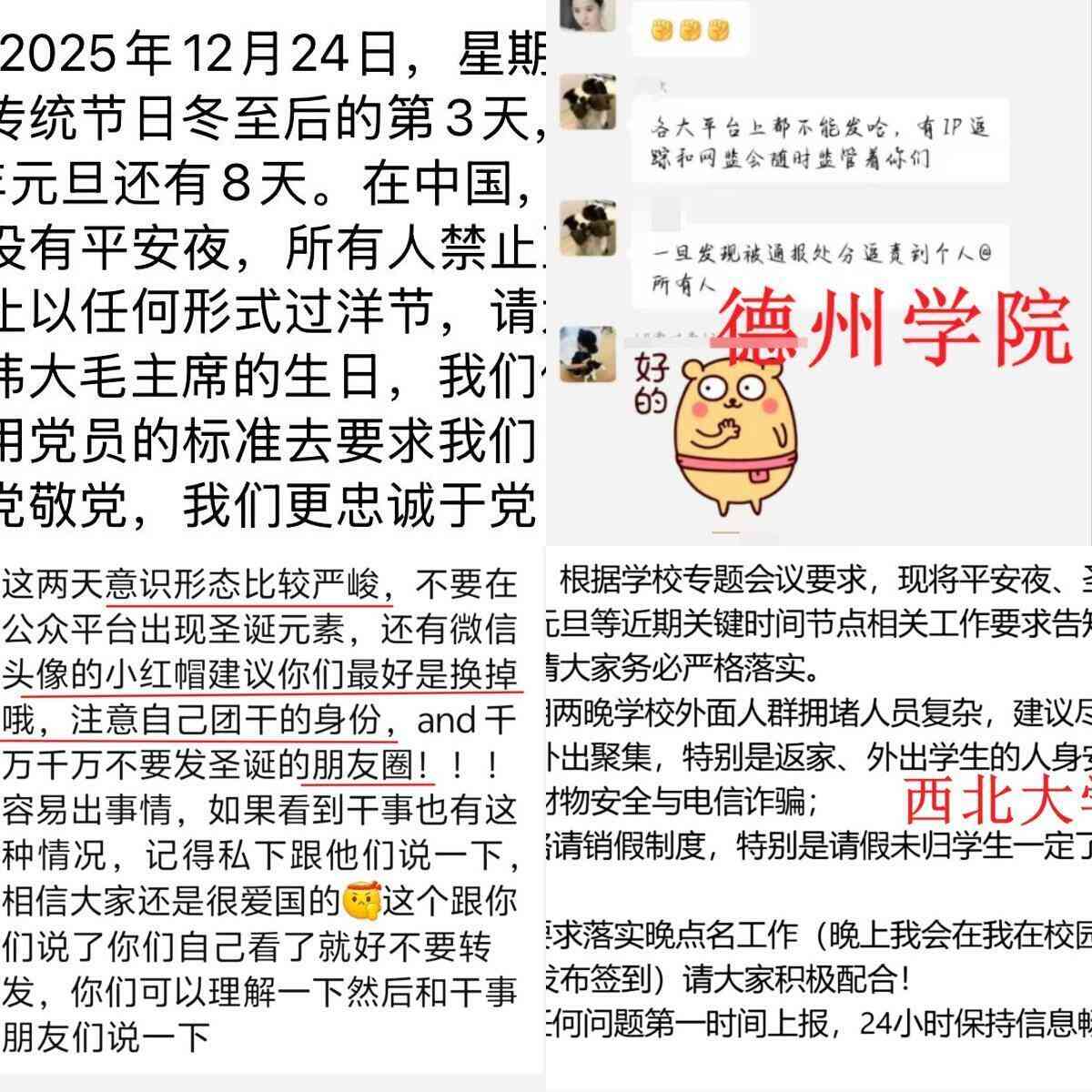 12月24日,山東德州學院要求學生不准發朋友圈,一經發現嚴肅處理,有輔導員表示,「IP跟蹤和網監會隨時監管著你們,一旦發現即追責到個人,這是很嚴肅的事情。」陝西西北大學要求今明(24日、25日)兩晚不外出不返家,每晚點名。