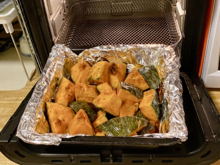 2. 焗爐預熱至375℉。烤盤內放入南瓜鋪開,放進焗爐烤15分鐘便可。◇