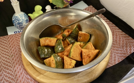 1. 在一個大碗內放入調味料拌勻後,放入南瓜拌勻備用。