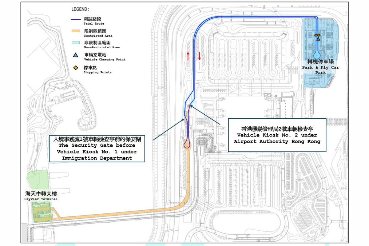 運輸署新聞稿顯示,整個測試項目規劃往來港珠澳大橋香港口岸「轉機停車場」至香港國際機場海天中轉大樓。目前,運輸署批准的測試路段範圍由「轉機停車場」延伸至機場限制區入口。