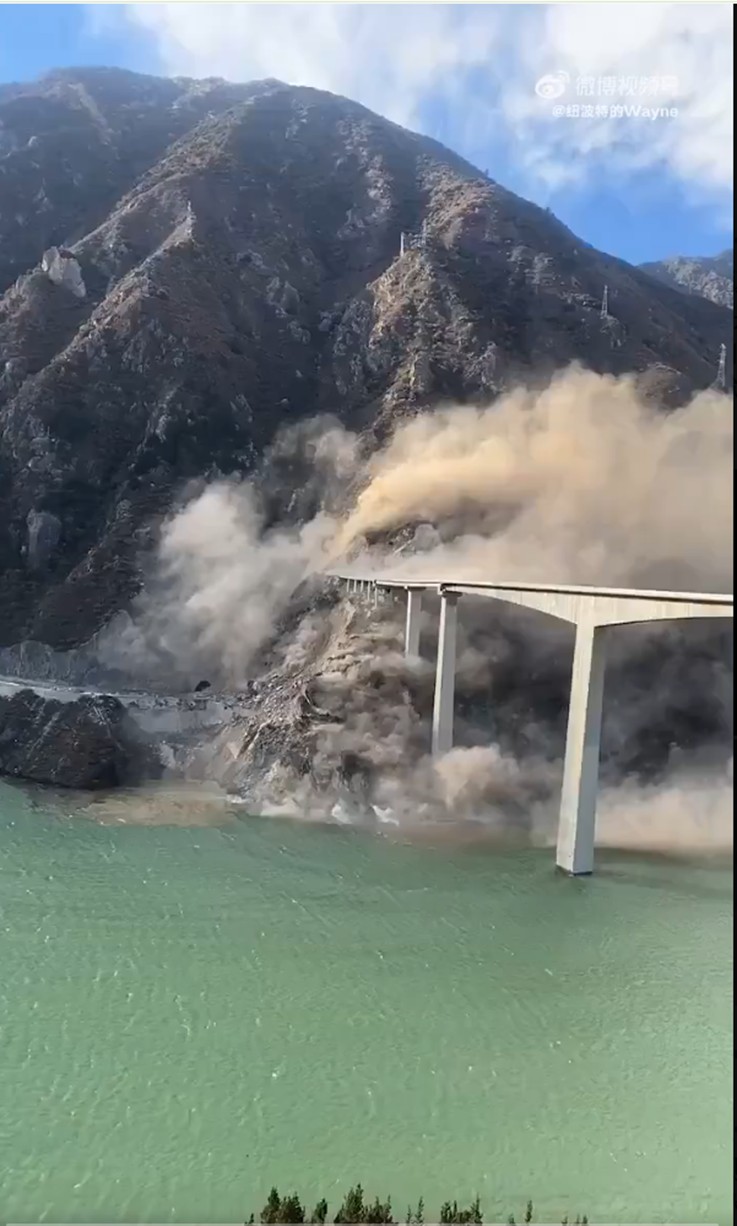 2025年11月11日,位於大渡河雙江口水庫核心庫區的紅旗特大橋發生垮塌。(影片截圖)