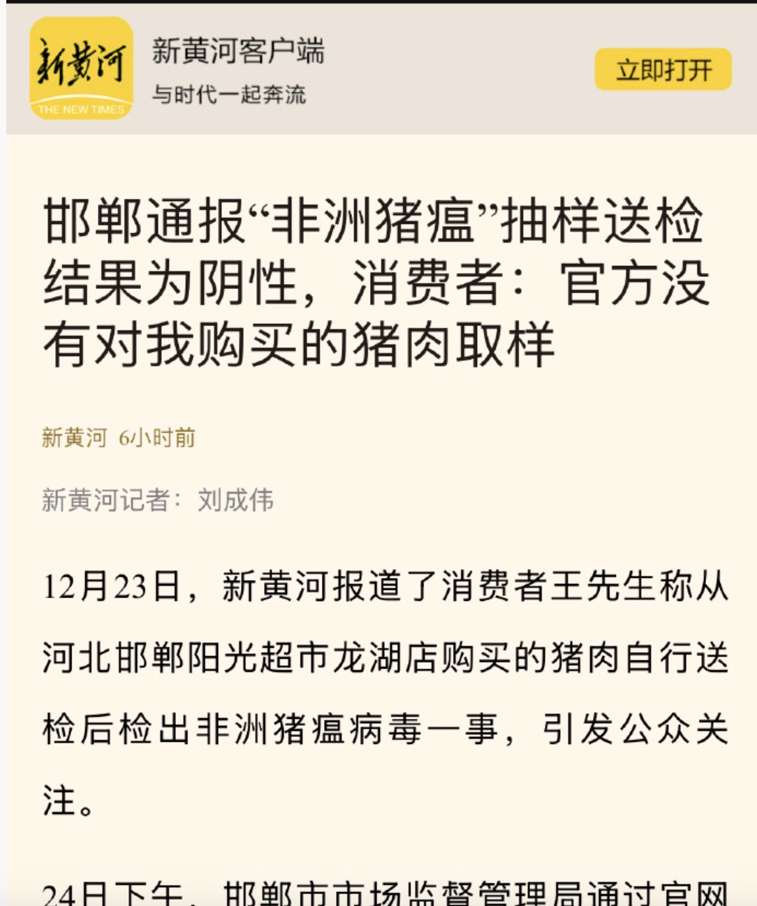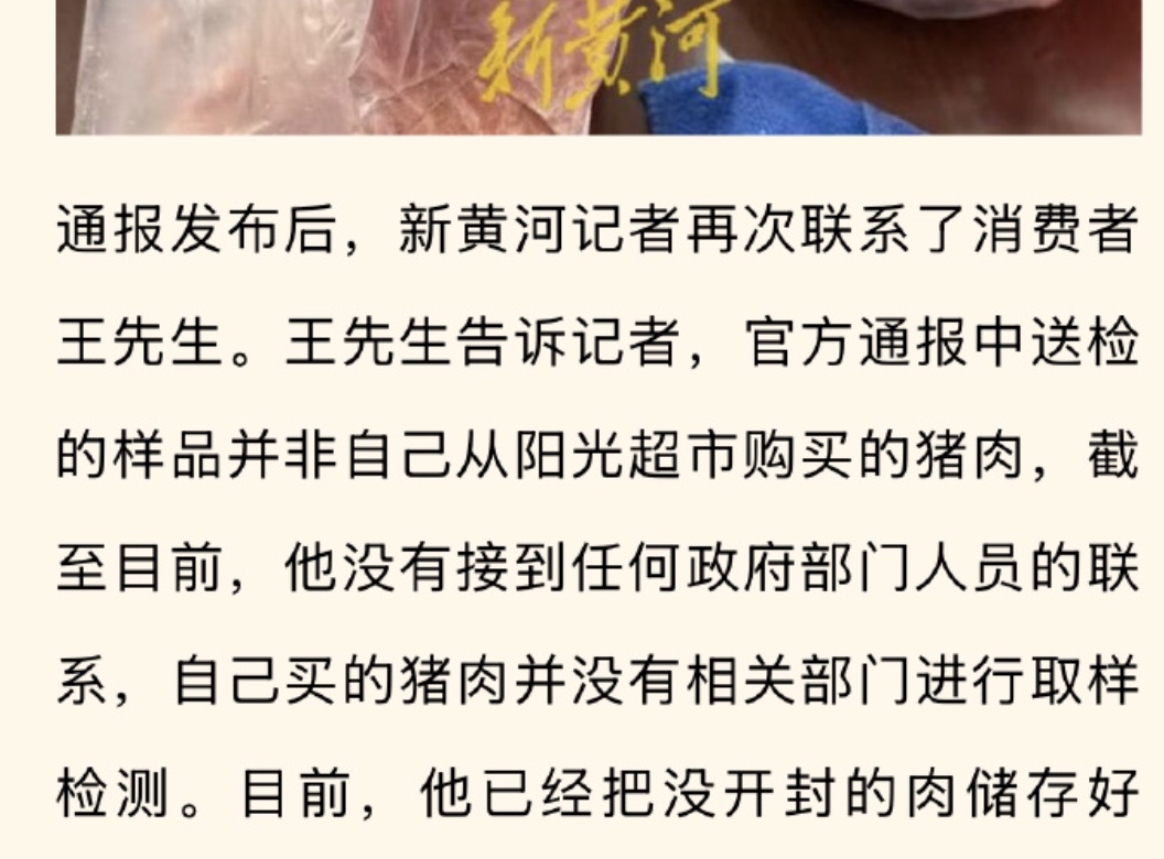 但是,據大陸媒體新黃河12月24日報道,消費者稱,官方沒有對他購買的豬肉取樣。報道稱,通報發布後,新黃河記者再次聯繫了消費者王先生,王先生說,官方通報中送檢的樣品並非自己從陽光超市購買的豬肉,截止目前,他沒有接到任何政府部門人員的聯繫,自己購買的豬肉並沒有相關部門進行取樣檢測。