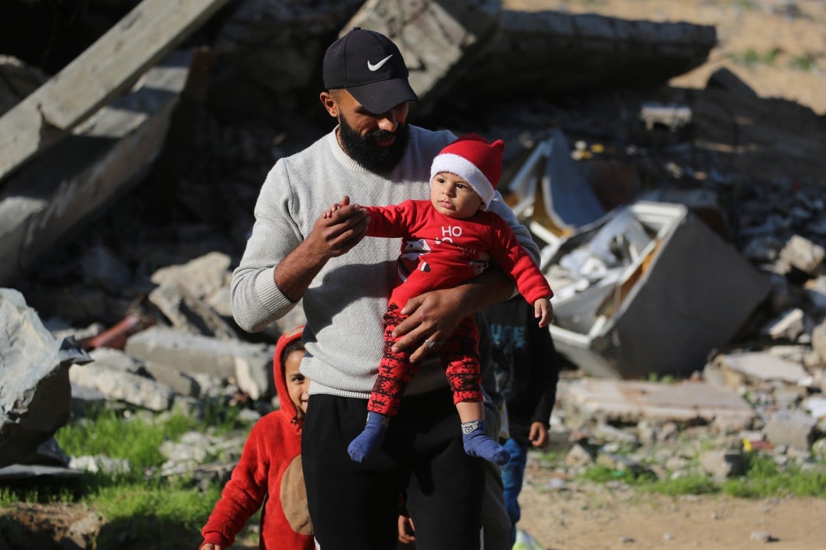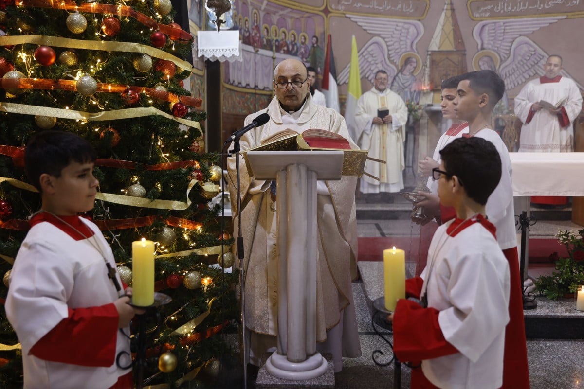 在加沙,眾多巴勒斯坦人在平安夜湧入該地區唯一的天主教堂,在以哈停火後首度慶祝聖誕節。