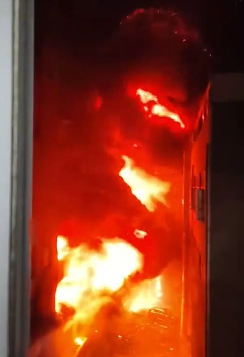 現場片段顯示,被燒的廠房火光沖天,濃濃的黑煙瀰漫在天空中……