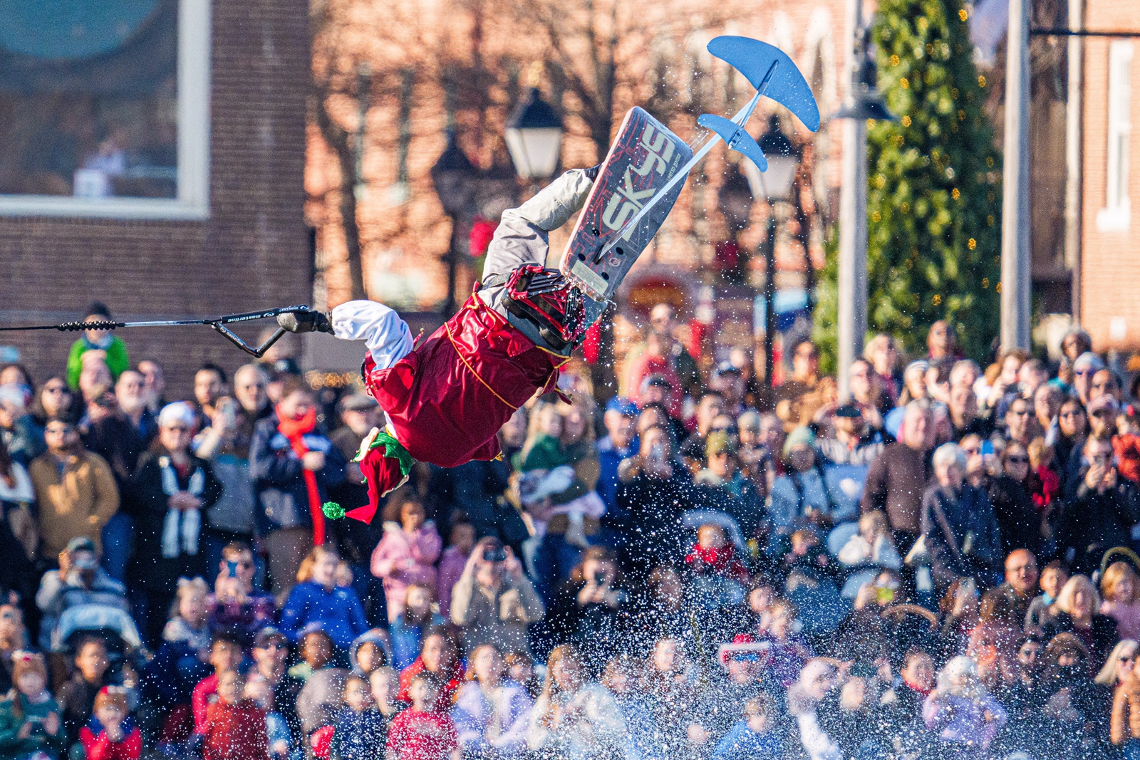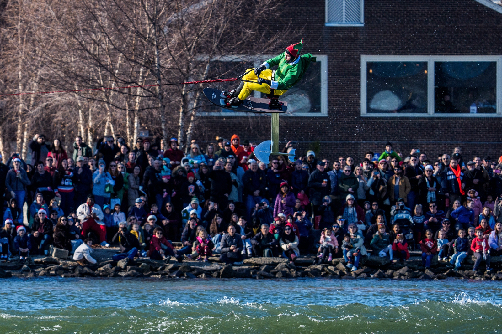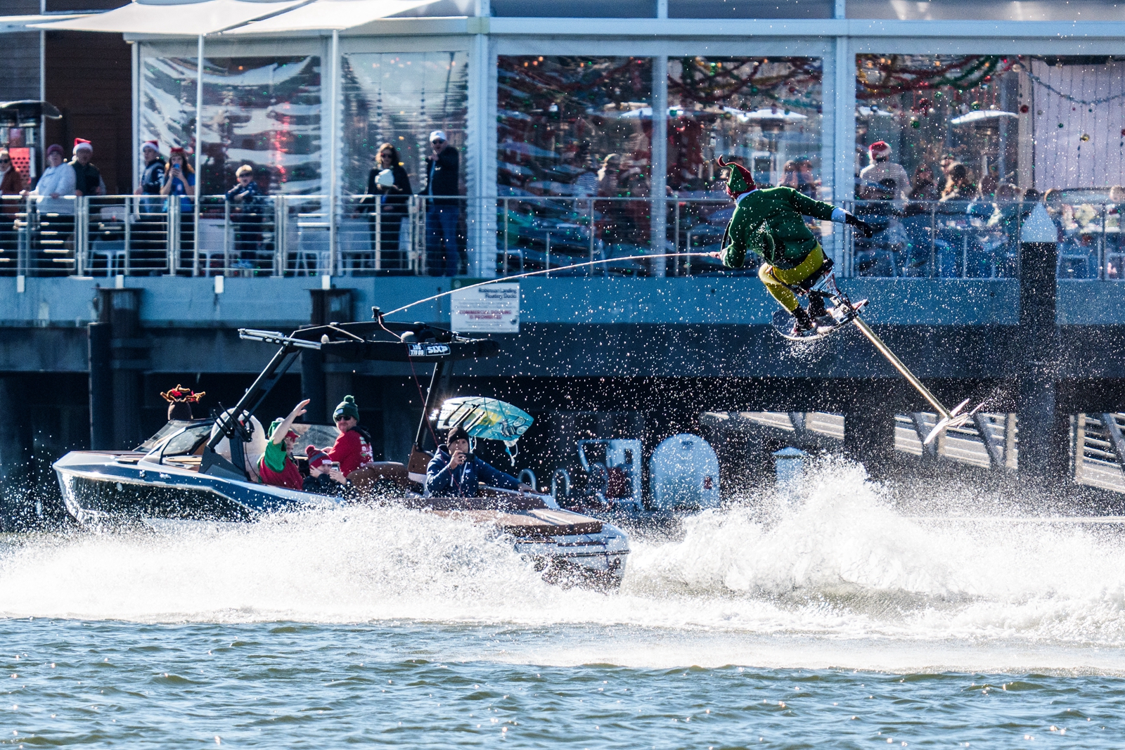 2025年12月24日平安夜,在美國維珍尼亞州亞歷山大老城舉行的聖誕老人滑水活動中,一名裝扮成聖誕小精靈的滑水愛好者展示高難度動作。(Aaron Schwartz/Getty Images)