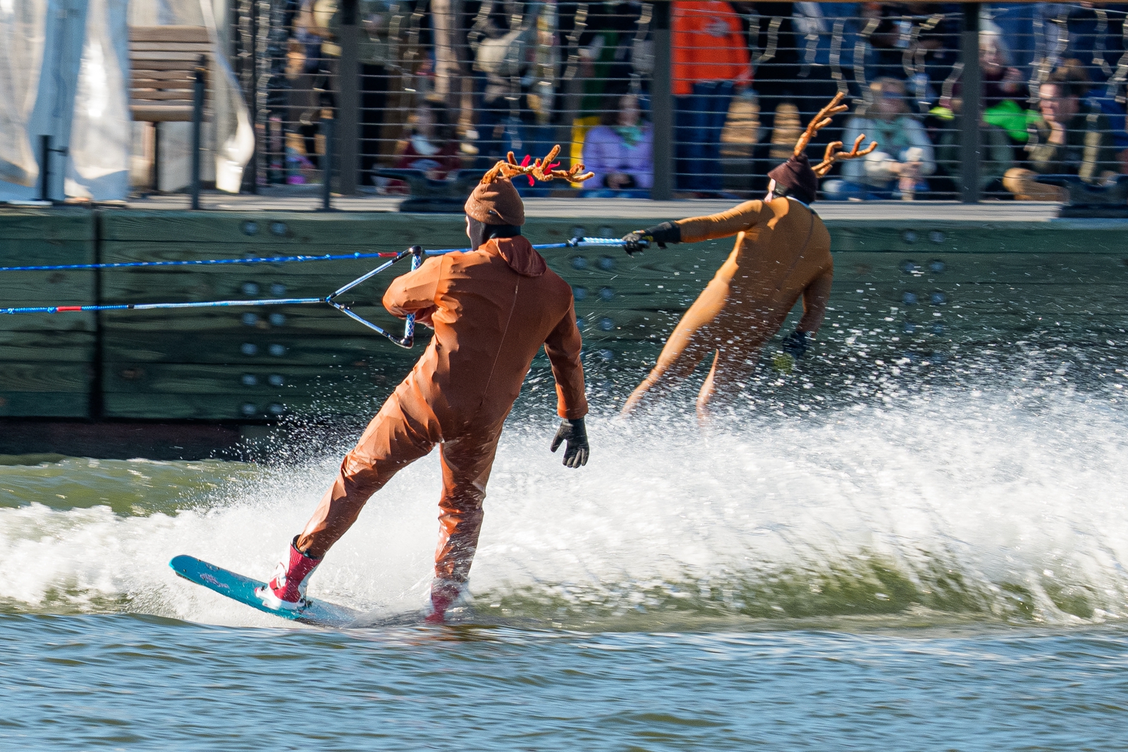 2025年12月24日平安夜,在美國維珍尼亞州亞歷山大老城舉行的聖誕老人滑水活動中,滑水愛好者裝扮成馴鹿進行滑水錶演。(Aaron Schwartz/Getty Images)