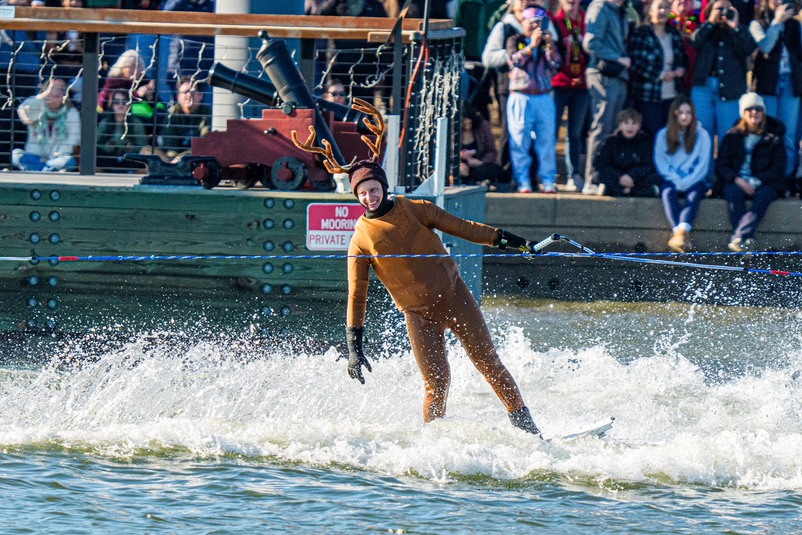 2025年12月24日平安夜,在美國維珍尼亞州亞歷山大老城舉行的聖誕老人滑水活動中,一名滑水愛好者裝扮成馴鹿進行滑水錶演。(Aaron Schwartz/Getty Images)