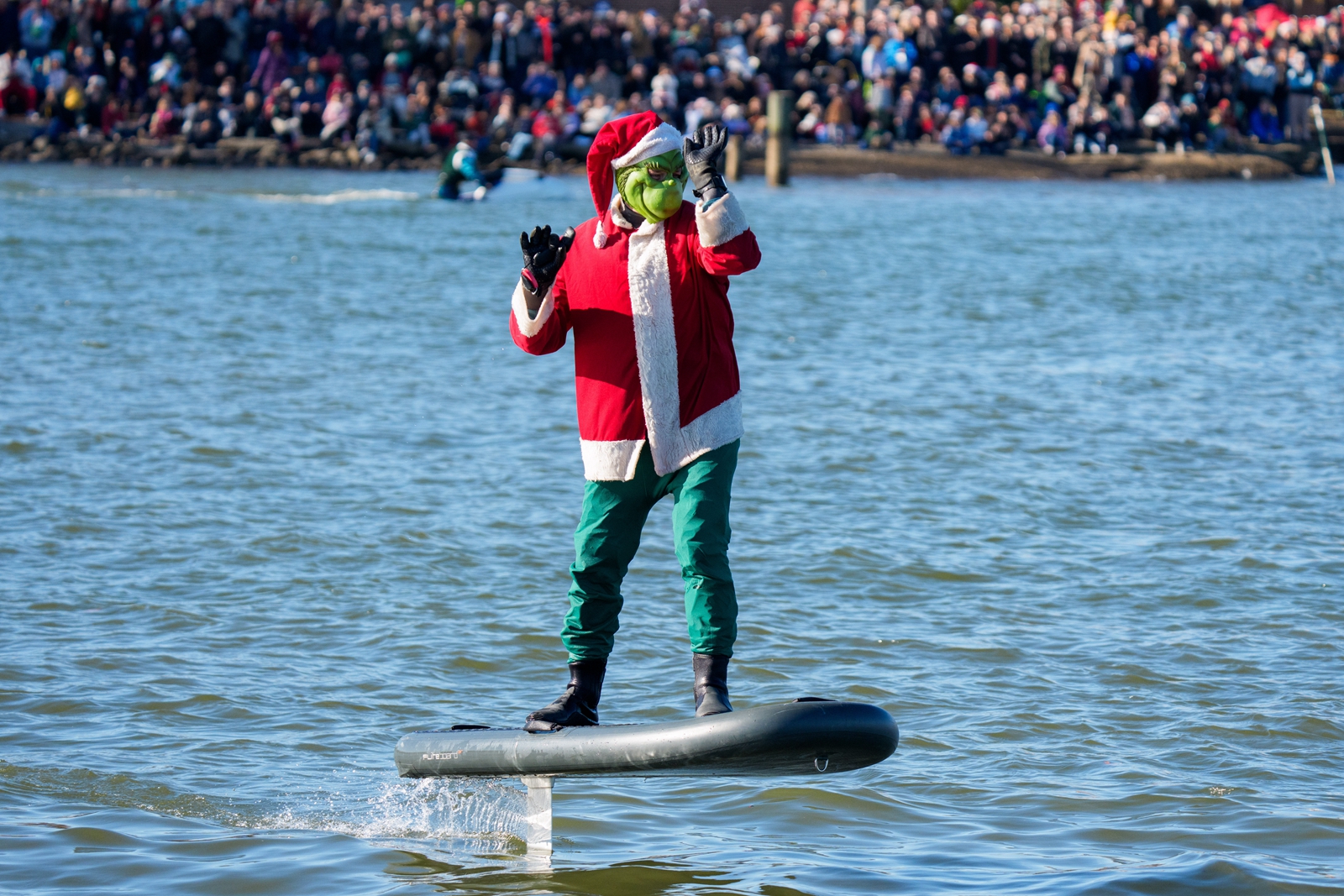 2025年12月24日平安夜,在美國維珍尼亞州亞歷山大老城舉行的聖誕老人滑水活動中,一個裝扮成綠毛怪格林奇的人進行滑水表演。(Aaron Schwartz/Getty Images)