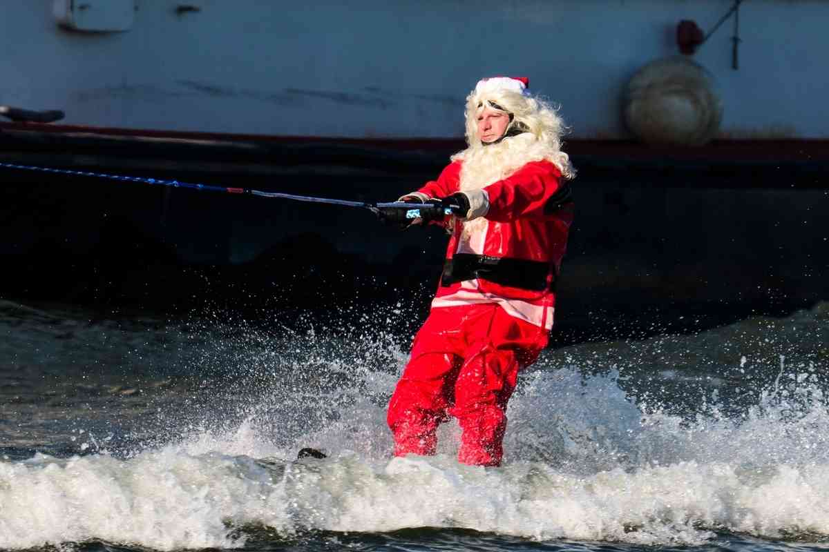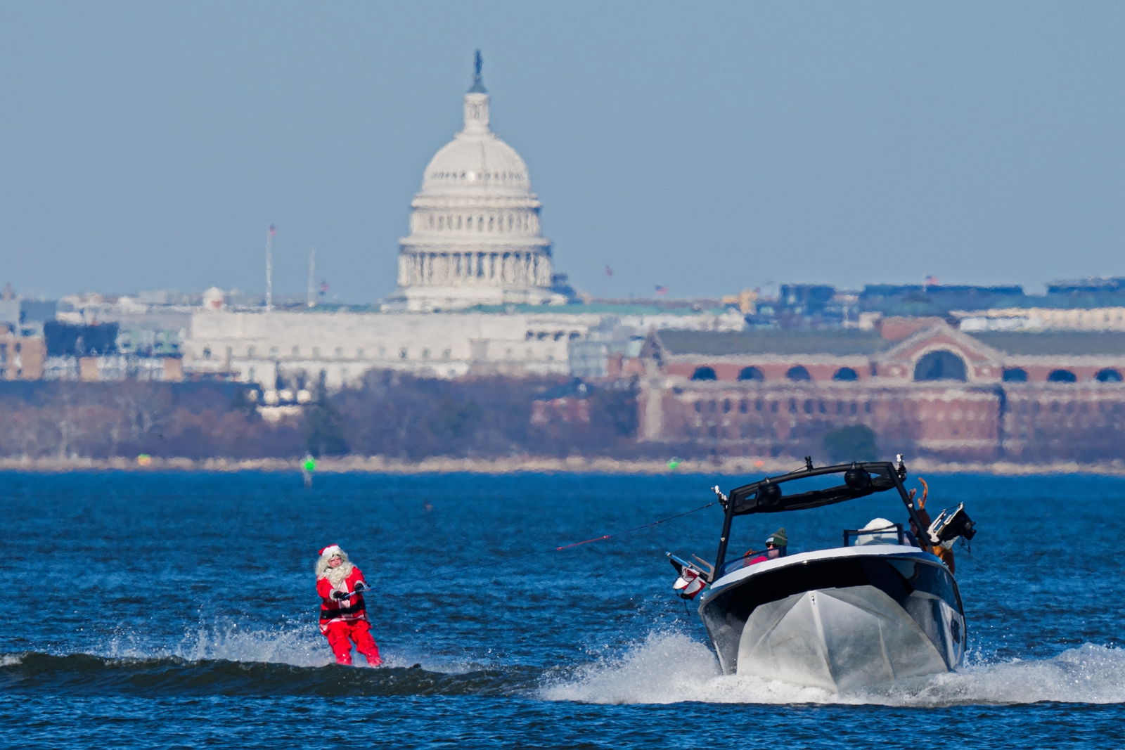2025年12月24日平安夜,在美國維珍尼亞州亞歷山大老城舉行的聖誕老人滑水活動中,一名滑水愛好者裝扮成聖誕老人進行滑水錶演。(Aaron Schwartz/Getty Images)