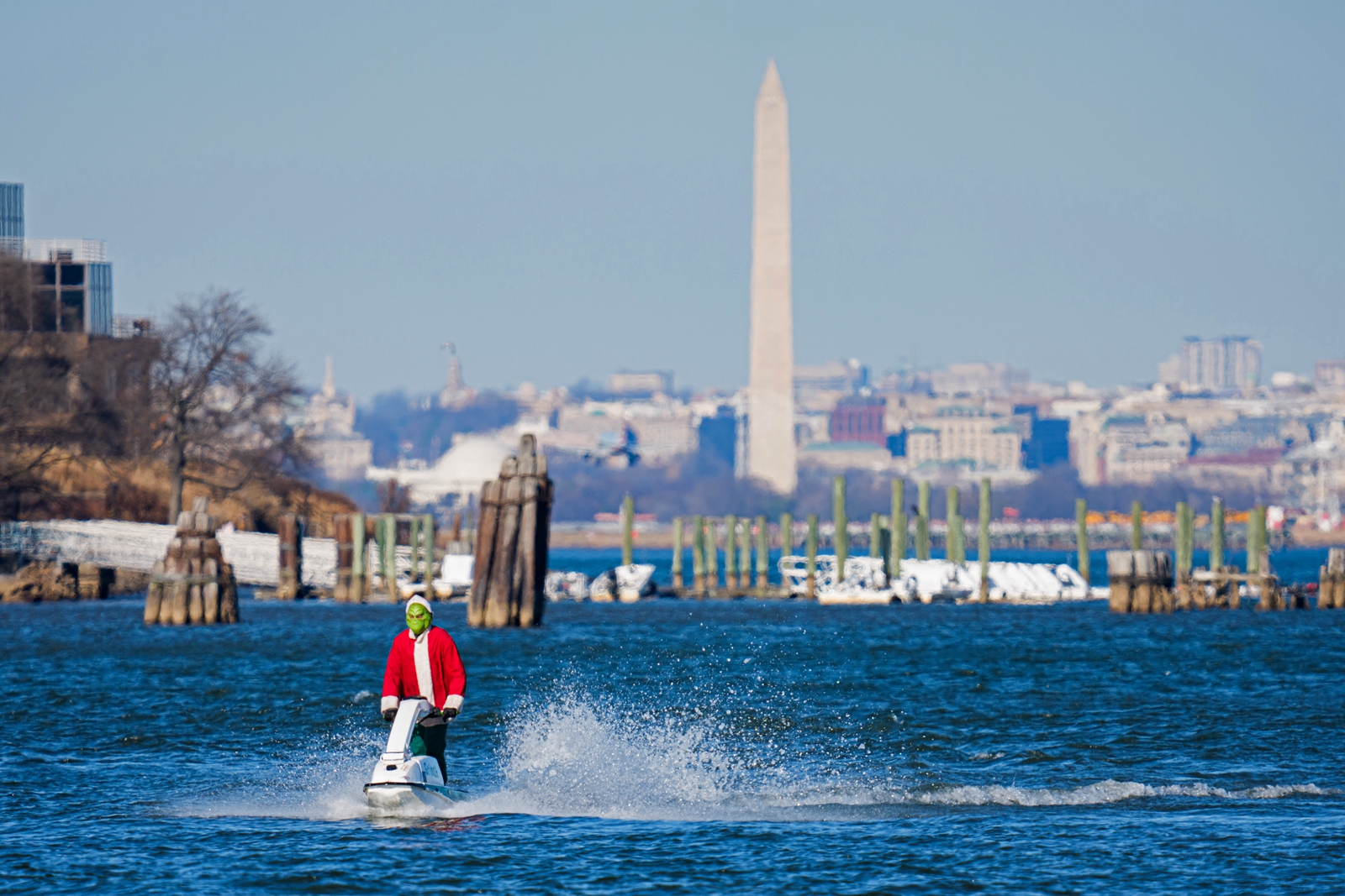 2025年12月24日平安夜,在美國維珍尼亞州亞歷山大老城舉行的聖誕老人滑水活動中,一個裝扮成綠毛怪格林奇的人獨自駕駛一艘摩托艇。(Aaron Schwartz/Getty Images)