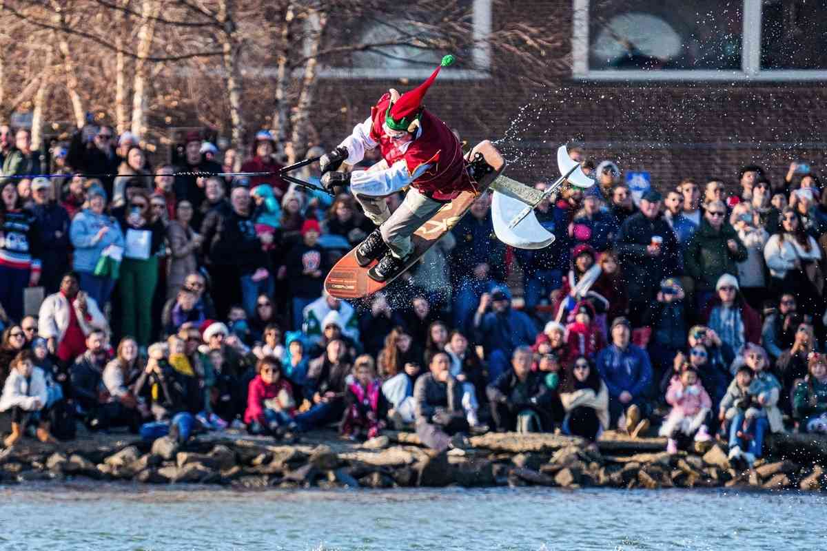 只見他們踏著水橇乘風破浪而來,一邊做著跳躍、翻轉等高難度的滑水動作,一邊向岸上的觀眾揮手致意,引來觀眾的陣陣歡呼和喝采,使他們暫時忘卻了冬日的寒冷。
